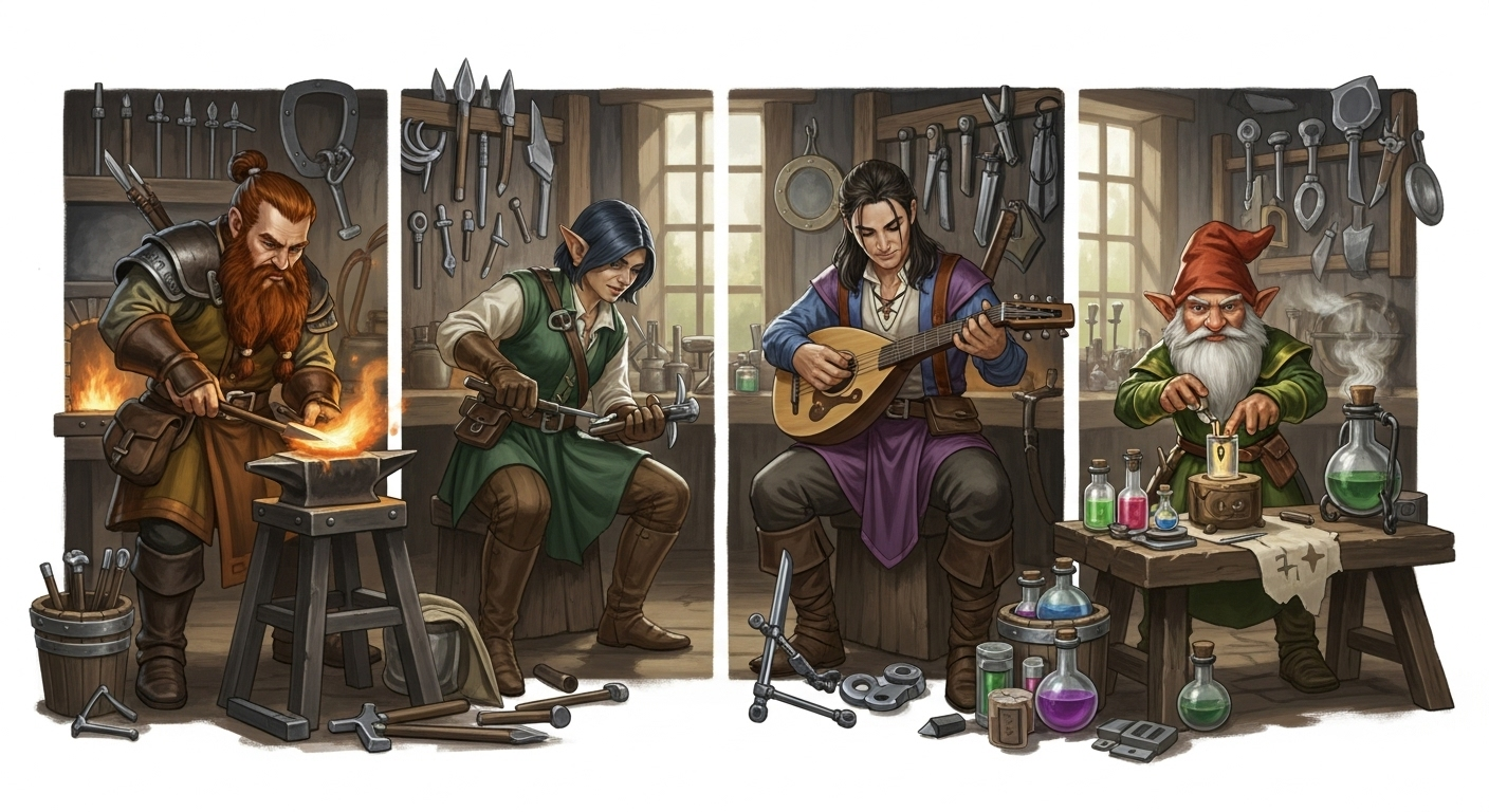 - Artisan's Tools: Specialized crafting implements like Smith's Tools, Alchemist's Supplies, or Jeweler's Tools that allow creation of specific items