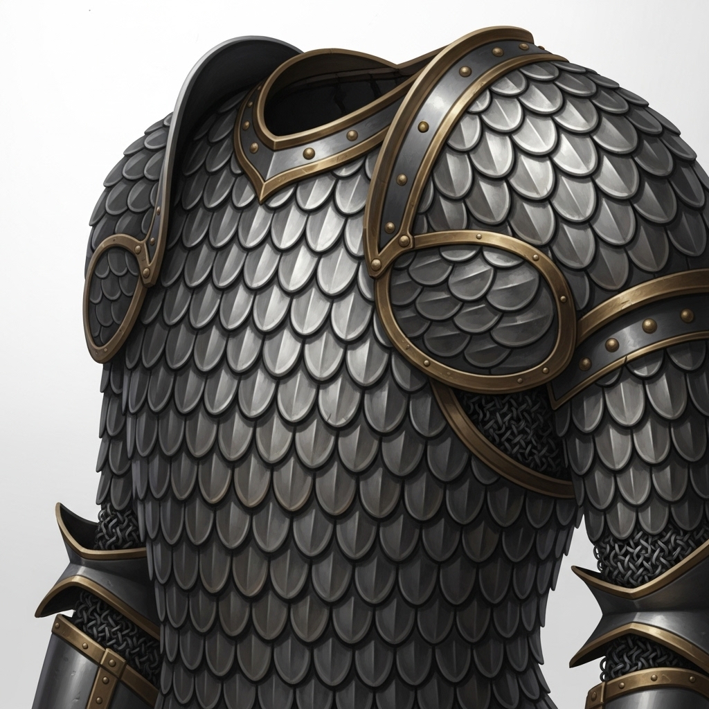 Scale mail consists of a coat and leggings (and perhaps a separate skirt) of leather covered with overlapping pieces of metal, much like the scales of a fish. The suit includes gauntlets and the overlapping scales create noise when moving.