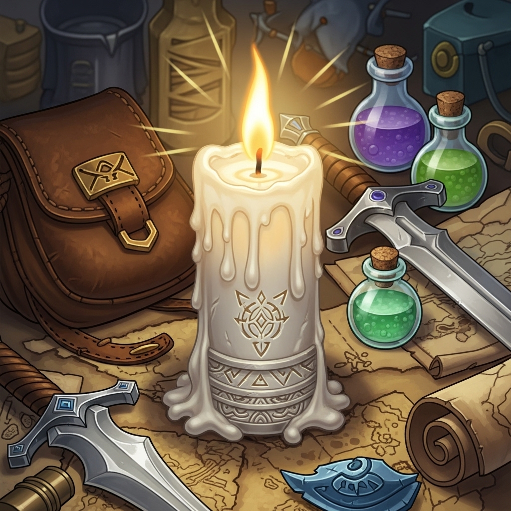 A candle is a simple light source consisting of a wick surrounded by wax or tallow. When lit, it provides a small but reliable flame that burns for approximately one hour. Candles are among the most basic and affordable light sources available to adventurers.