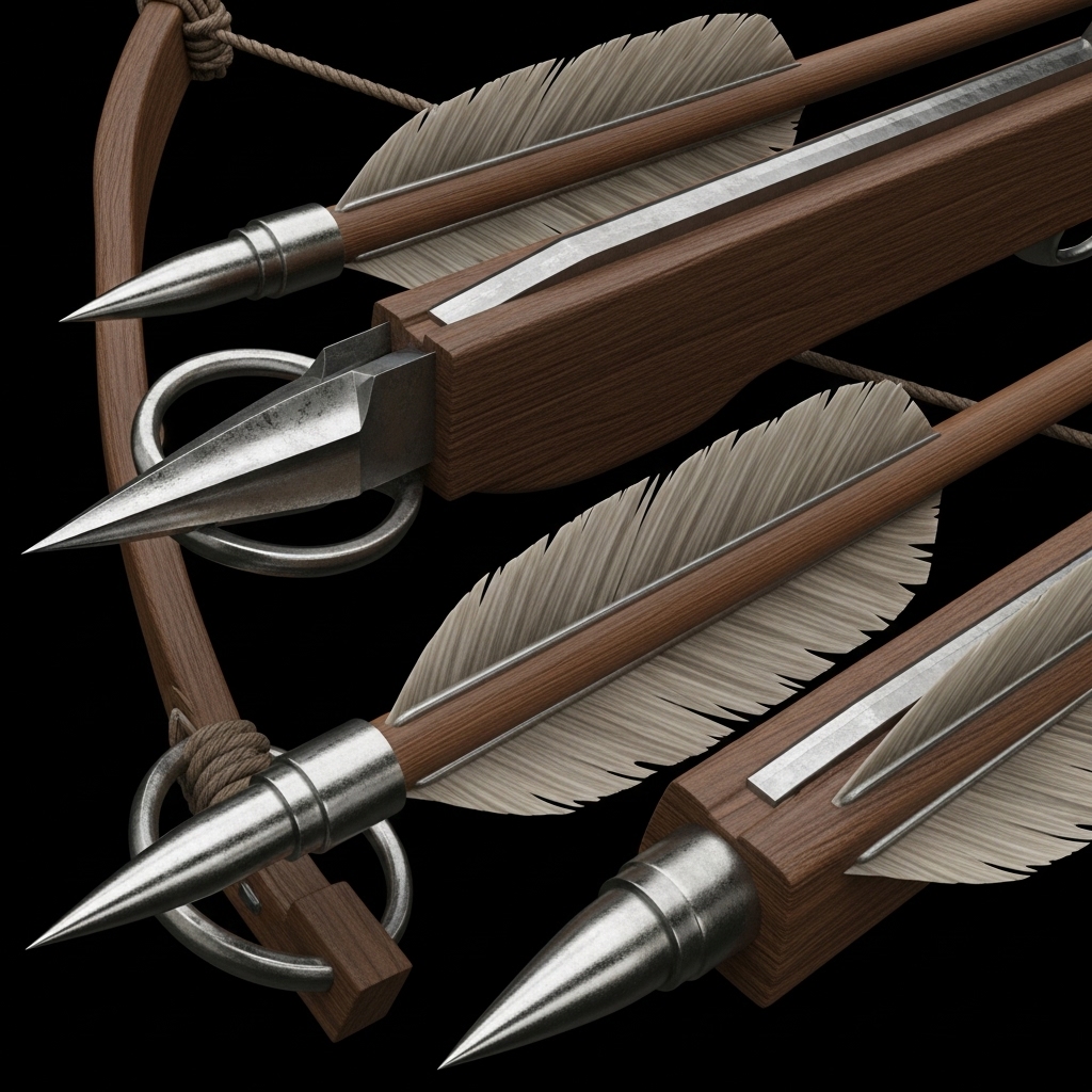 Bodkin Bolts: Narrow points for maximum armor penetration Broadhead Bolts: Wide cutting heads for hunting applications Incendiary Bolts: Fire-starting tips for siege warfare Grappling Bolts: Attached lines for climbing or retrieval Explosive Bolts: Alchemical charges for special operations
