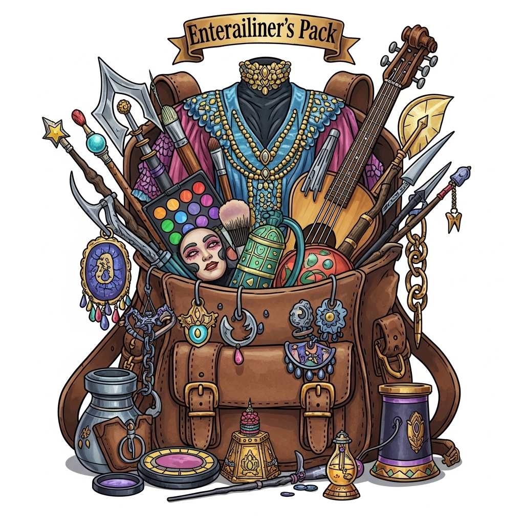 The entertainer's pack is a comprehensive collection designed for performers, storytellers, and those who make their living through the arts. This pack provides everything needed for performances, audience engagement, and maintaining a performer's lifestyle on the road.