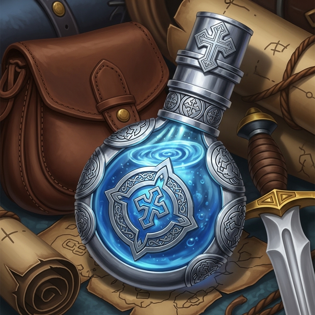 Holy water is ordinary water that has been blessed by a cleric or paladin through sacred rituals. This consecrated liquid is imbued with divine energy that makes it particularly effective against fiends and undead creatures. It is typically stored in small glass vials or flasks.