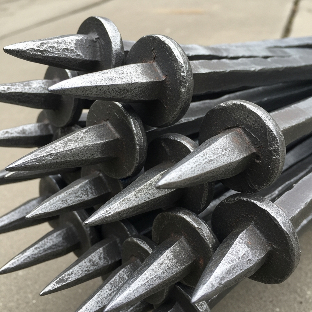 Length: Typically 6-8 inches for optimal holding power Material: Forged iron for strength and durability Point: Sharp tip for penetrating various surfaces Head: Flat surface for hammer impact and removal