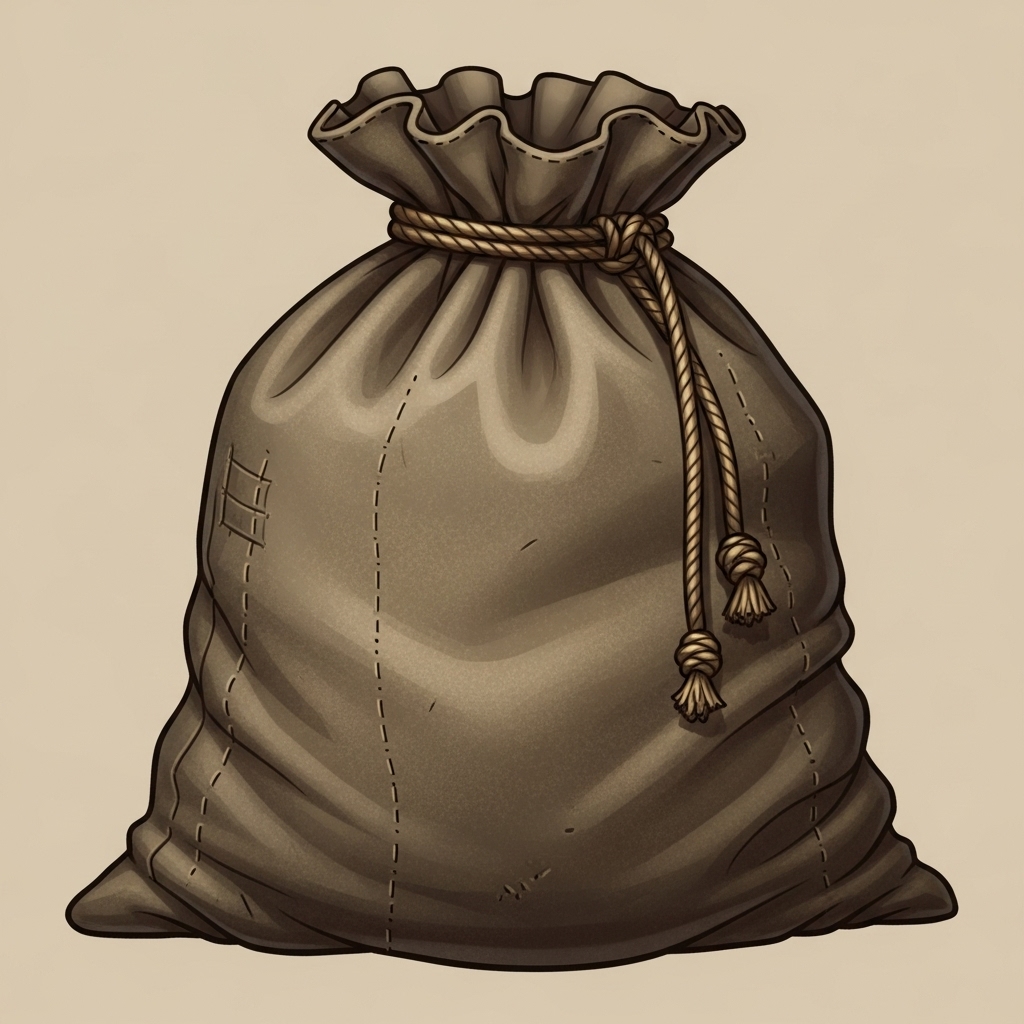 A simple cloth or burlap bag designed for carrying bulk items and supplies. This inexpensive container is essential for gathering materials, transporting goods, and storing equipment that doesn't require weather protection or security.