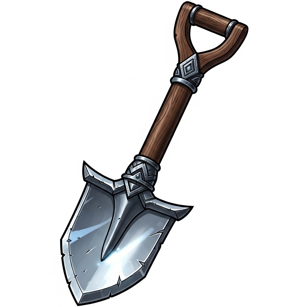 A sturdy digging tool with a broad metal blade and wooden handle. Essential for excavation work, the shovel allows adventurers to dig through earth, sand, and soft materials efficiently. Its reinforced construction can handle heavy use in various soil conditions.