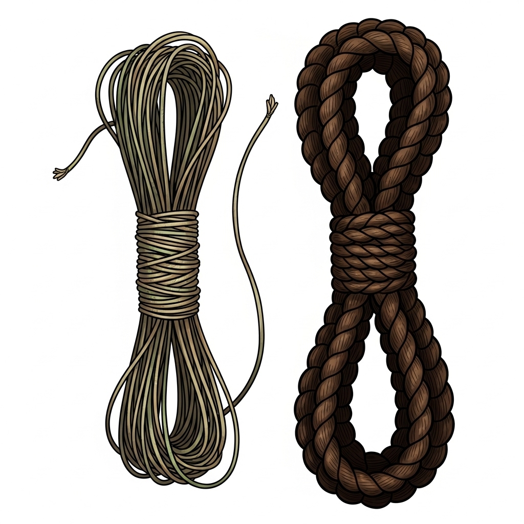 String is a thin cord made from twisted fibers, typically hemp, cotton, or linen. While not as strong as rope, string is lightweight, versatile, and useful for countless small tasks and emergency situations.