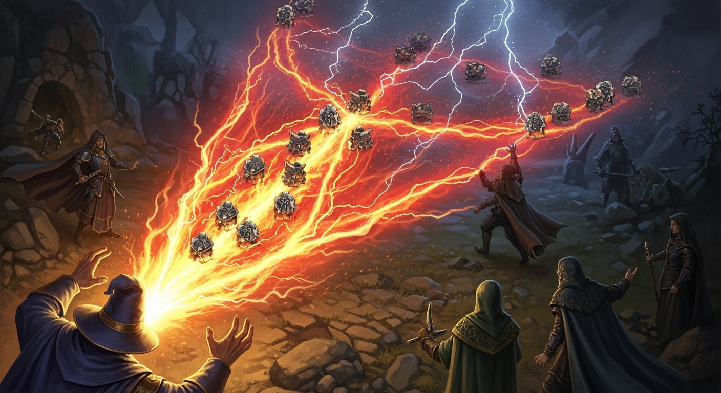 A Cone is an area of effect that extends in straight lines from a point of origin in a direction its creator chooses. A Cone's width at any point along its length is equal to that point's distance from the point of origin. For example, a Cone is 15 feet wide at a point along its length that is 15 feet from the point of origin. The effect that creates a Cone specifies its maximum length. A Cone's point of origin isn't included in the area of effect unless its creator decides otherwise.
